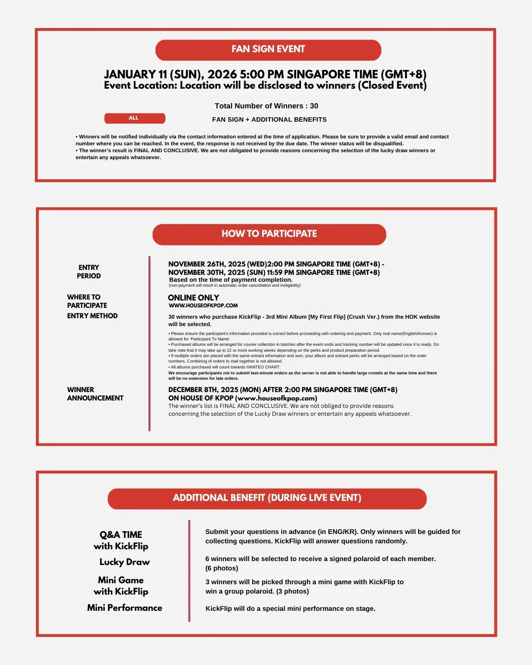 Please read through the fan sign event notice carefully before submitting the order. Once order is submitted, it is deemed that you have agreed to theĀ terms and conditions indicated in the link and also the terms and conditions indicated in the event notice.