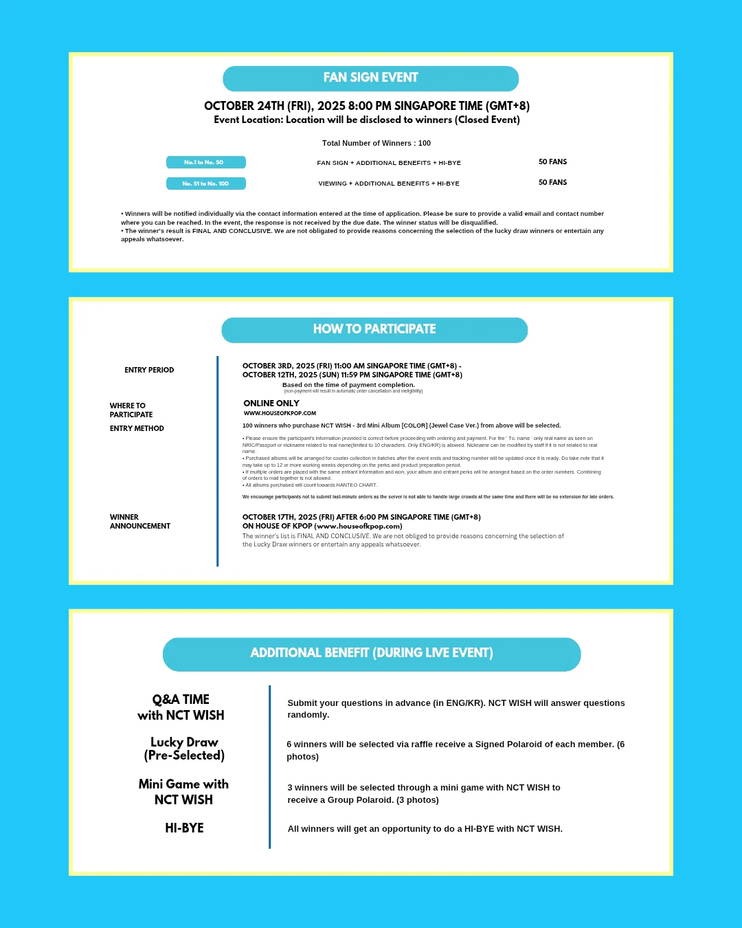 Please read through the fan sign event notice carefully before submitting the order. Once order is submitted, it is deemed that you have agreed to the terms and conditions indicated in the link and also the terms and conditions indicated in the event notice.